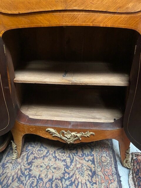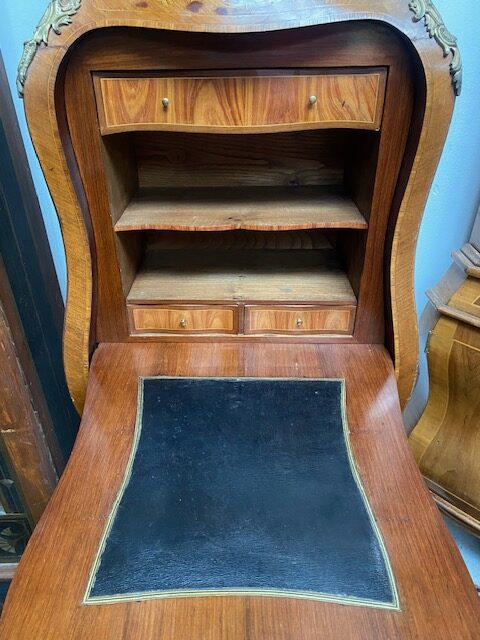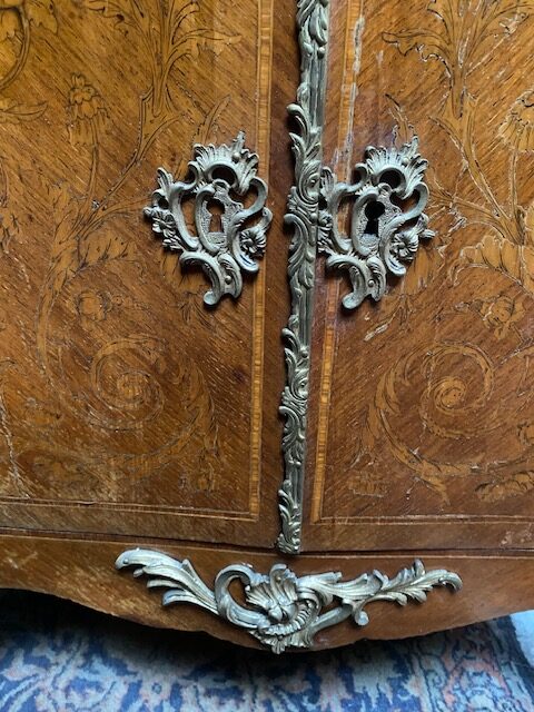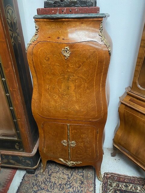 Intarzovaný psací sekretář bohatě zdobený s mramorovou deskou a mosazným kováním 60*144*35