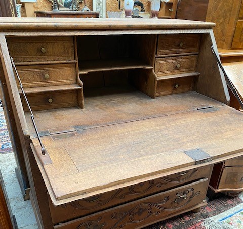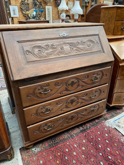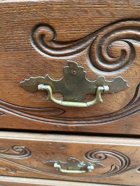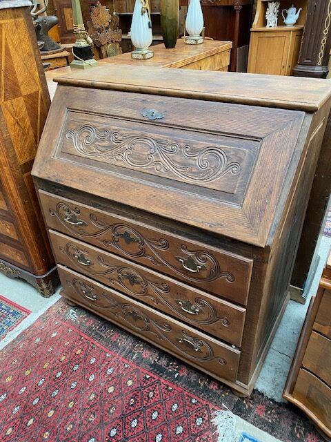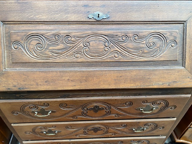 Psací komoda-masiv zdobená řezbovaním a mosazným kováním 107*116*60