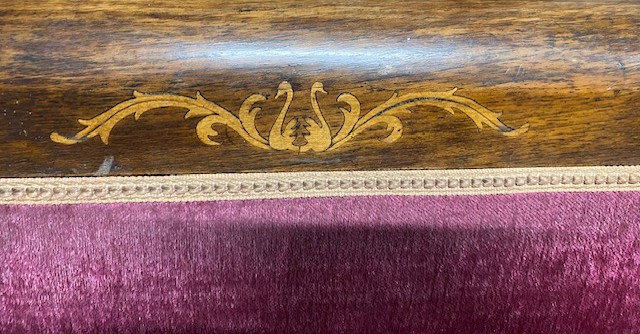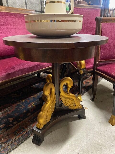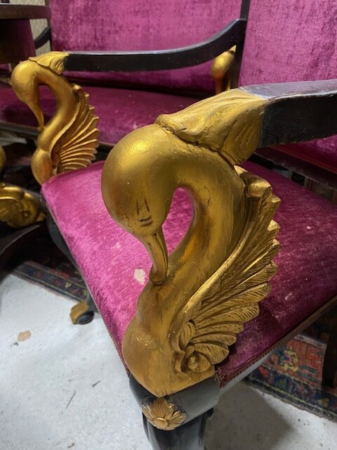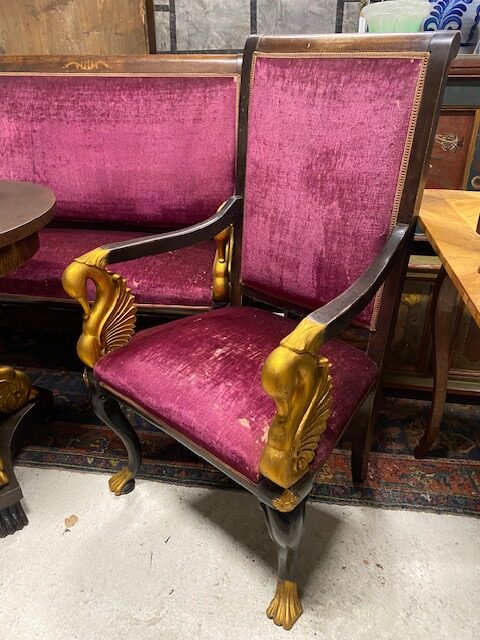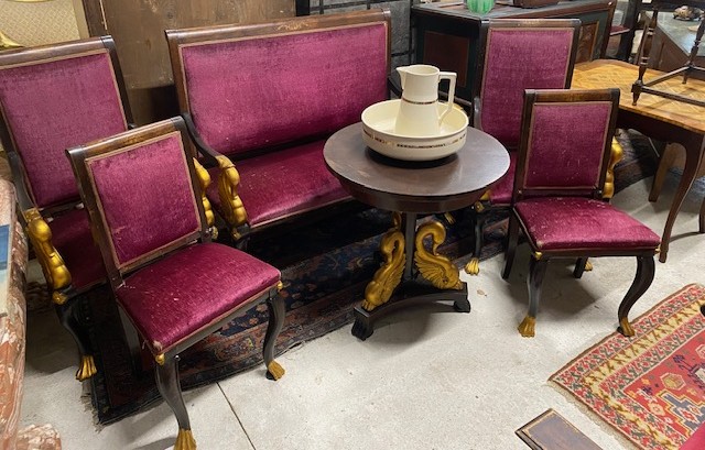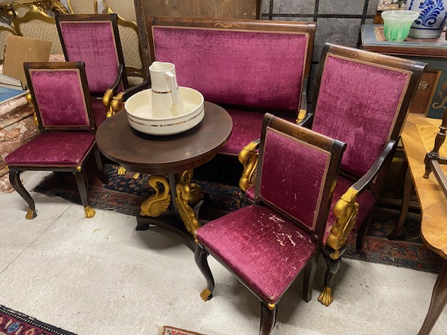 Sezení 5+1 zdobené řezbovanými labutěmi,součástí sezení je 2*křeslo 63*113*56 dále 2*židle 50*94*42 dále stůl 70*77 a sofa 131*112*65