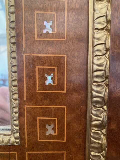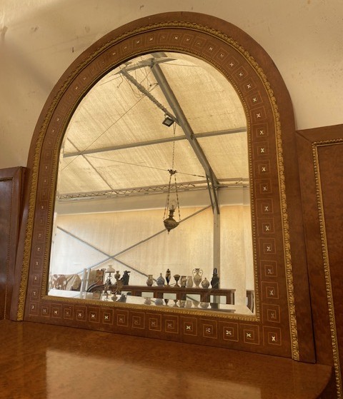 Skleník se zrcadlem zakomponovaný v kořenicové stěně,zrcadlo zdobené kořenicovou dýhou a perletí 130*260*35